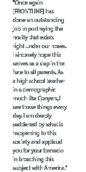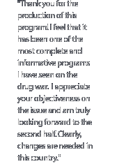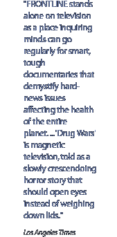 "They all say that the real solution here is drug treatment, prevention, and education -- that you can't arrest your way out of the problem," Bergman says. "FRONTLINE's investigation revealed that almost everyone agrees how to solve this problem, but in the end we don't have the political courage to do it."