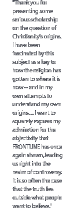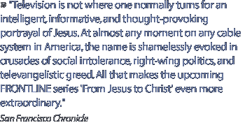 FRONTLINE ventured into new territory with its four-hour long documentary "From Jesus to Christ." Long recognized as PBS's premier investigative journalism series, FRONTLINE had been searching for a project that would explore the increasing power and significance of spirituality and religion in American life. It found that project not in today's headlines, but in new discoveries about the birth of Christianity and its development as a force that would dominate Western culture for 2,000 years.