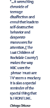 Husband and wife producers Rachel Dretzin and Barak Goodman first traveled to affluent Conyers, Georgia, to chronicle an all-too-typical American town where teen loneliness and alienation were escaped through drinking, drugs, and promiscuous sex.