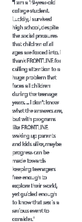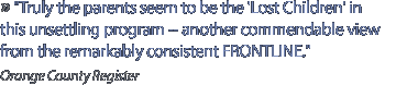 "Wherever we went, we met kids who were drifting -- hungry for something to fill the void left by too much time on their own and too little structure in their lives," says Dretzin. "The result was these spasms of violence and sexual precocity with little concern for the consequences."