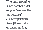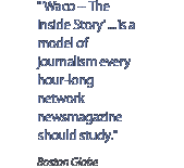 Many of the files used in researching the documentary -- including excerpts from the FBI's audiotaped negotiations with Koresh -- can be found on the film's companion Web site at www.pbs.org/frontline. In fact, "Waco -- The Inside Story" bears the distinction of being not only the first FRONTLINE documentary to feature an accompanying Web site but also the first content-rich editorial Web site in history. "We entered this new world of online publishing because our documentaries, often a year in the making, generated huge amounts of corollary research that simply couldn't all be put into an hour-long film," executive producer David Fanning recalls. "By collecting all these interviews and tapes and materials and posting them on the Web site for the world to study and understand, we make our journalism transparent. It's a way for us to say, 'We feel comfortable enough with what we've said in this documentary that you can review the underlying materials and come to understand them in the way we have.'"