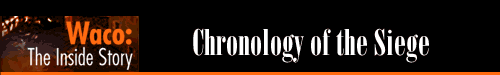 [Ed. Note: This chronology was published in 1995 with the initial broadcast of "Waco: the Inside Story." In August, 1999, documents were uncovered which indicated that during the raid on the Branch Davidian compound, the FBI used a limited number of flammable tear gas canisters. This revelation contradicted assertions of the FBI and the Department of Justice that the government had done nothing that could have contributed to the start or spread of the fire. In response, Attorney General Janet Reno appointed a special counsel, former Republican senator John C. Danforth, to reexamine the assault to determine how the fire started and whether there was a cover-up of information implicating law enforcement officials or the Justice Department.
