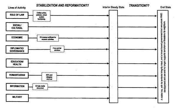 The document also notes that Iraq's oil revenues alone will not be sufficient to pay for reconstruction, and predicts an extended period of instability in the postwar period: "The most probable threat will come from residual pockets of fanatics, secessionist groups, terrorists and those [who] would seek to exploit ethnic, religious, and tribal fault lines for personal gain. The threat from these groups would manifest itself in high impact tactics such as car or suicide bombings, sniping, and 'hit and run' raids. A high level of such attacks will have an adverse impact on the creation of stability, a prerequisite for self-sustaining peace."
