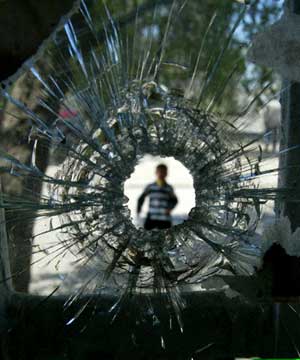 A broken window from a March 2003 airstrike by coalition forces remains in the home of Talib Aziz in Baghdad March 20, 2005. Aziz's ten-year-old son Jallal Talib was killed during the bombing. (© Faleh Kheiber/Reuters/Corbis)